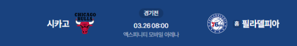 2026년 3월 25일(현지 시각) / 3월 26일(목) 08:00 (KST) 예정 | NBA 정규 시즌 시카고 불스 vs 필라델피아 76ers 분석
