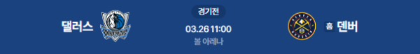 2026년 3월 25일(현지 시각) / 3월 26일(목) 11:00 (KST) 예정 | NBA 정규 시즌 댈러스 매버릭스 vs 덴버 너게츠 분석