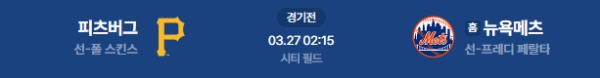 2026년 3월 26일(현지 시각) / 3월 27일(금) 02:15 (KST) 예정 | MLB 개막전 피츠버그 파이리츠 vs 뉴욕 메츠 분석