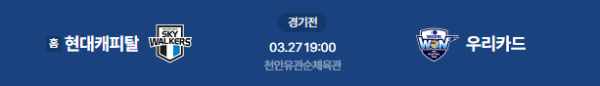 경기 예정 시간: 2026년 3월 27일 19:00 (KST) / 장소: 천안 유관순체육관