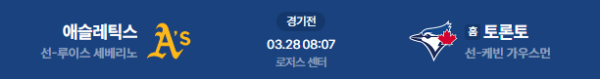 2026년 3월 28일(토) 08:07(KST) 예정된 MLB 정규시즌 오클랜드 애슬레틱스 vs 토론토 블루제이스의 경기 분석 리포트입니다.