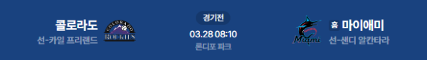 2026년 3월 28일(토) 08:10(KST) 예정된 MLB 정규시즌 콜로라도 로키스 vs 마이애미 말린스의 경기 분석 리포트입니다.