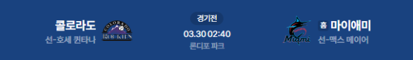 2026년 3월 30일(월) 02:40(KST) 예정된 MLB 정규시즌 콜로라도 로키스 vs 마이애미 말린스의 경기 분석 리포트입니다.