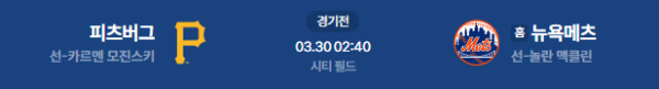 2026년 3월 30일(월) 02:40(KST) 예정된 MLB 정규시즌 피츠버그 파이리츠 vs 뉴욕 메츠의 경기 분석 리포트입니다.