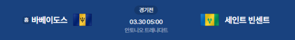 2026년 3월 30일(월) 05:00(KST) 예정된 바베이도스 vs 세인트 빈센트 그레나딘의 국가대표 친선 경기 분석 리포트입니다.