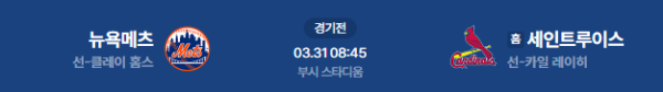 2026년 3월 31일(화) 08:45(KST) 세인트루이스의 부시 스타디움에서 열리는 뉴욕 메츠 vs 세인트루이스 카디널스의 MLB 정규시즌 매치업 분석 리포트입니다.