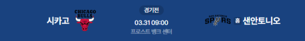 2026년 3월 31일(화) 09:00(KST) 샌안토니오의 프로스트 뱅크 센터에서 열리는 시카고 불스 vs 샌안토니오 스퍼스의 NBA 정규시즌 매치업 분석 리포트입니다.