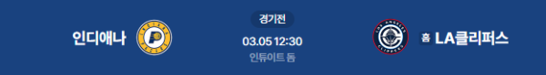 2026년 3월 5일 (목) 12:30 (KST) 예정 | NBA 정규 시즌 인디애나 페이서스 vs LA 클리퍼스 분석