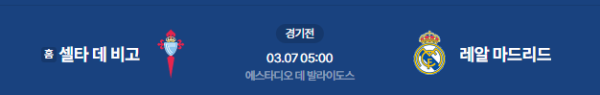 레알 마드리드가 전반 초반 선제골을 터뜨리며 경기를 주도할지가 관건입니다. 셀타 비고는 **이아고 아스파스**의 개인 기량에 의존한 역습을 노리겠지만, 안정적인 레알의 수비진을 뚫기에는 역부족일 가능성이 높습니다.