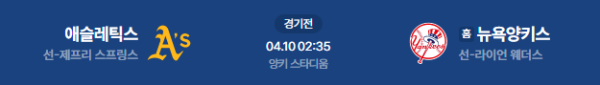 2026년 4월 10일(금) 02:35 (KST) MLB: 오클랜드 애슬레틱스 vs 뉴욕 양키스