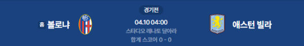 2026년 4월 10일(금) 04:00 (KST) UEFA 유로파리그 8강 1차전: 볼로냐 FC vs 애스턴 빌라