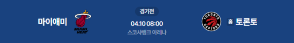 2026년 4월 10일(금) 08:00 (KST) NBA 정규 시즌: 마이애미 히트 vs 토론토 랩터스