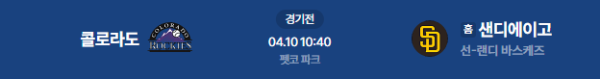 2026년 4월 10일(금) 10:40 (KST) MLB 정규 시즌: 콜로라도 로키스 vs 샌디에이고 파드리스