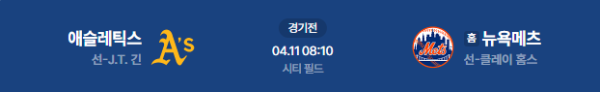 2026년 4월 11일(토) 05:10 (KST) 메이저리그: 오클랜드 애슬레틱스 vs 뉴욕 메츠