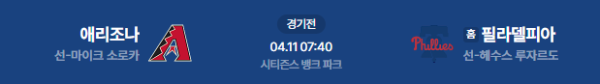 2026년 4월 11일(토) 10:05 (KST) MLB 정규 시즌: 애리조나 다이아몬드백스 vs 필라델피아 필리스