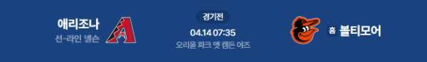 2026년 4월 14일(화) 07:35 (KST) 메이저리그(MLB): 애리조나 다이아몬드백스 vs 볼티모어 오리올스