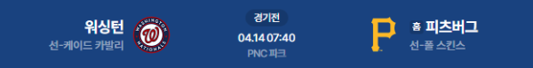 2026년 4월 14일(화) 07:40 (KST) 메이저리그(MLB): 워싱턴 내셔널스 vs 피츠버그 파이리츠