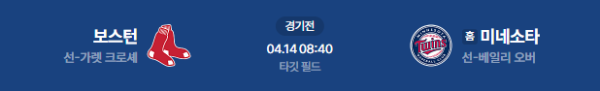 2026년 4월 14일(화) 08:40 (KST) 메이저리그(MLB): 보스턴 레드삭스 vs 미네소타 트윈스