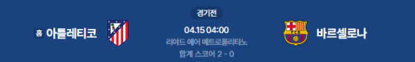 2026년 4월 15일(수) 04:00 (KST) UEFA 챔피언스리그 8강 2차전: 아틀레티코 마드리드 vs 바르셀로나