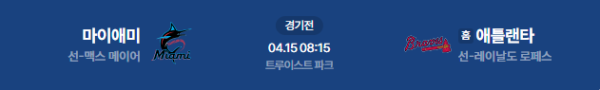 2026년 4월 15일(수) 08:20 (KST) 메이저리그(MLB): 마이애미 말린스 vs 애틀랜타 브레이브스