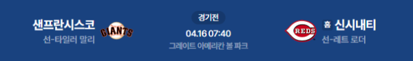 2026년 4월 16일(목) 오전 07:40(KST) 메이저리그: 샌프란시스코 자이언츠 vs 신시내티 레즈
