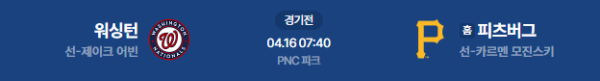 2026년 4월 16일(목) 오전 07:40(KST) 메이저리그: 워싱턴 내셔널스 vs 피츠버그 파이리츠