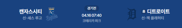 2026년 4월 16일(목) 오전 07:40(KST) 메이저리그: 캔자스시티 로열스 vs 디트로이트 타이거즈