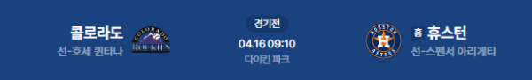 2026년 4월 16일(목) 오전 09:10(KST) 메이저리그: 콜로라도 로키스 vs 휴스턴 애스트로스