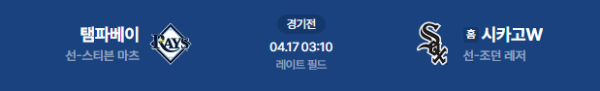 2026년 4월 17일(금) 오전 03:10(KST) 메이저리그: 탬파베이 레이스 vs 시카고 화이트삭스