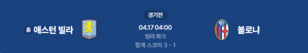 2026년 4월 17일(금) 오전 04:00(KST) 유로파리그: 애스턴 빌라 vs 볼로냐