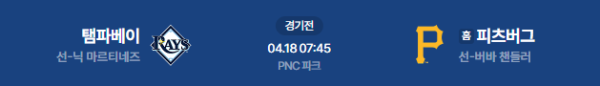 2026년 4월 18일(토) 오전 05:05(KST) 메이저리그: 탬파베이 레이스 vs 피츠버그 파이리츠