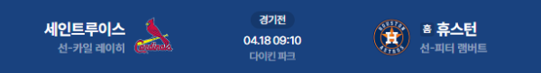 2026년 4월 18일(토) 오전 09:10(KST) 메이저리그: 세인트루이스 카디널스 vs 휴스턴 애스트로스