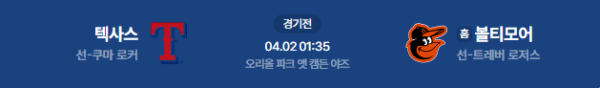 2026년 4월 2일(목) 01:35(KST) 미국 메릴랜드주 볼티모어의 오리올 파크 앳 캠든 야즈에서 열리는 텍사스 레인저스 vs 볼티모어 오리올스의 MLB 경기 분석 리포트입니다.