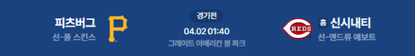 2026년 4월 2일(목) 01:40(KST) 미국 오하이오주 신시내티의 그레이트 아메리칸 볼 파크에서 열리는 피츠버그 파이리츠 vs 신시내티 레즈의 MLB 경기 분석 리포트입니다.