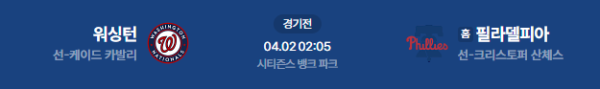 2026년 4월 2일(목) 02:05(KST) 미국 펜실베이니아주 필라델피아의 시티즌스 뱅크 파크에서 열리는 워싱턴 내셔널스 vs 필라델피아 필리스의 MLB 경기 분석 리포트입니다.