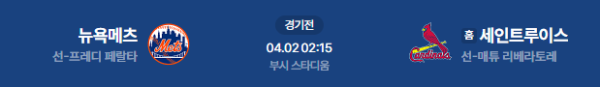 2026년 4월 2일(목) 02:15(KST) 미국 미주리주 세인트루이스의 부시 스타디움에서 열리는 뉴욕 메츠 vs 세인트루이스 카디널스의 MLB 경기 분석 리포트입니다.