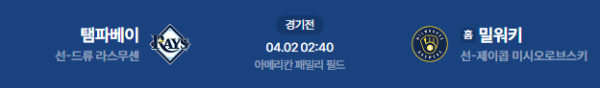 2026년 4월 2일(목) 02:40(KST) 미국 위스콘신주 밀워키의 아메리칸 패밀리 필드에서 열리는 탬파베이 레이스 vs 밀워키 브루어스의 MLB 경기 분석 리포트입니다.