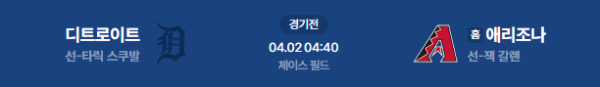 2026년 4월 2일(목) 04:40(KST) 미국 애리조나주 피닉스의 체이스 필드에서 열리는 디트로이트 타이거즈 vs 애리조나 다이아몬드백스의 MLB 경기 분석 리포트입니다.