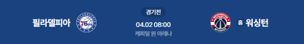 2026년 4월 2일(목) 08:00(KST) 미국 워싱턴 D.C.의 캐피털 원 아레나에서 열리는 필라델피아 세븐티식서스 vs 워싱턴 위저즈의 NBA 정규 시즌 경기 분석 리포트입니다.