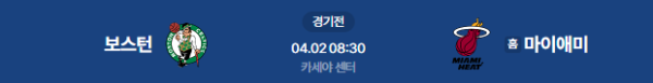 2026년 4월 2일(목) 08:30(KST) 미국 플로리다주 마이애미의 카세야 센터에서 열리는 보스턴 셀틱스 vs 마이애미 히트의 NBA 정규 시즌 경기 분석 리포트입니다.