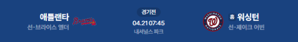 2026년 4월 21일(화) 오전 07:45(KST) 메이저리그: 애틀랜타 브레이브스 vs 워싱턴 내셔널스