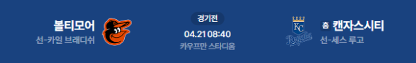 2026년 4월 21일(화) 오전 08:40(KST) 메이저리그: 볼티모어 오리올스 vs 캔자스시티 로열스