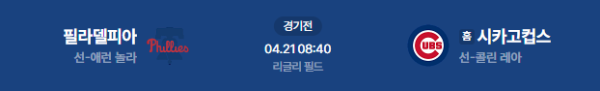 2026년 4월 21일(화) 오전 08:40(KST) 메이저리그: 필라델피아 필리스 vs 시카고 컵스