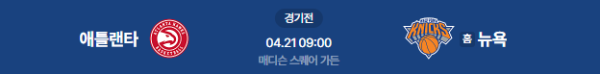 2026년 4월 21일(화) 오전 09:10(KST) NBA 동부 컨퍼런스 플레이오프 1라운드 2차전: 애틀랜타 호크스 vs 뉴욕 닉스