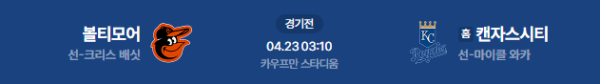 2026년 4월 23일(목) 오전 03:10 (KST) 메이저리그(MLB) 정규시즌: 볼티모어 오리올스 vs 캔자스시티 로열스