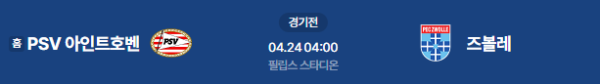 2026년 4월 24일(금) 오전 04:00 (KST) 네덜란드 에레디비시 31라운드: PSV 아인트호벤 vs PEC 즈볼레