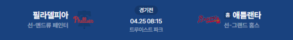 2026년 4월 25일(토) 오전 08:15 (KST) 메이저리그(MLB): 필라델피아 필리스 vs 애틀랜타 브레이브스