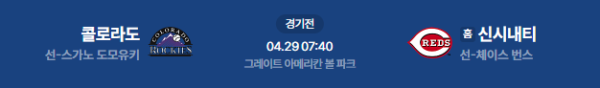 2026년 4월 29일(수) 오전 07:40 (KST) 메이저리그(MLB): 신시내티 레즈 vs 콜라라도 로키스