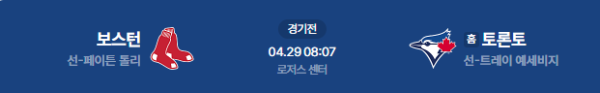 2026년 4월 29일(수) 오전 08:07 (KST) 메이저리그(MLB): 토론토 블루제이스 vs 보스턴 레드삭스