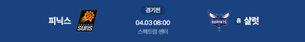 2026년 4월 3일(금) 08:00(KST) 미국 노스캐롤라이나주 샬럿의 스펙트럼 센터에서 열리는 피닉스 선즈 vs 샬럿 호네츠의 NBA 정규 시즌 경기 분석 리포트입니다.